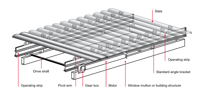 The most efficient and effective way to control the rack arms. The system can be opened tilted at various degrees for light filtration or completely open at 90° for maximum daylight by a press of a button. The electric motor incorporates internal thermal protection against overheating. Various control options and levels of sophistication are available.